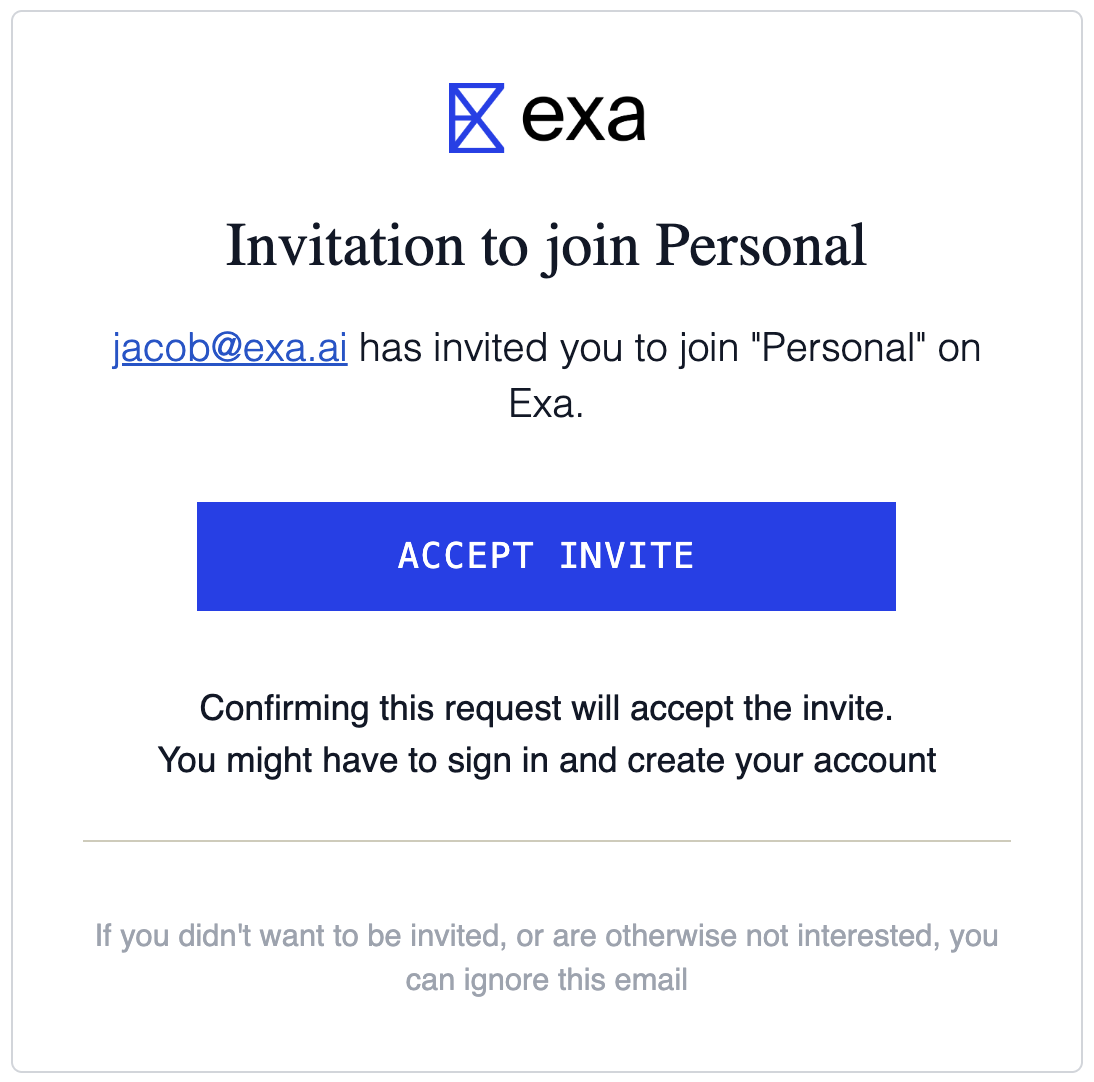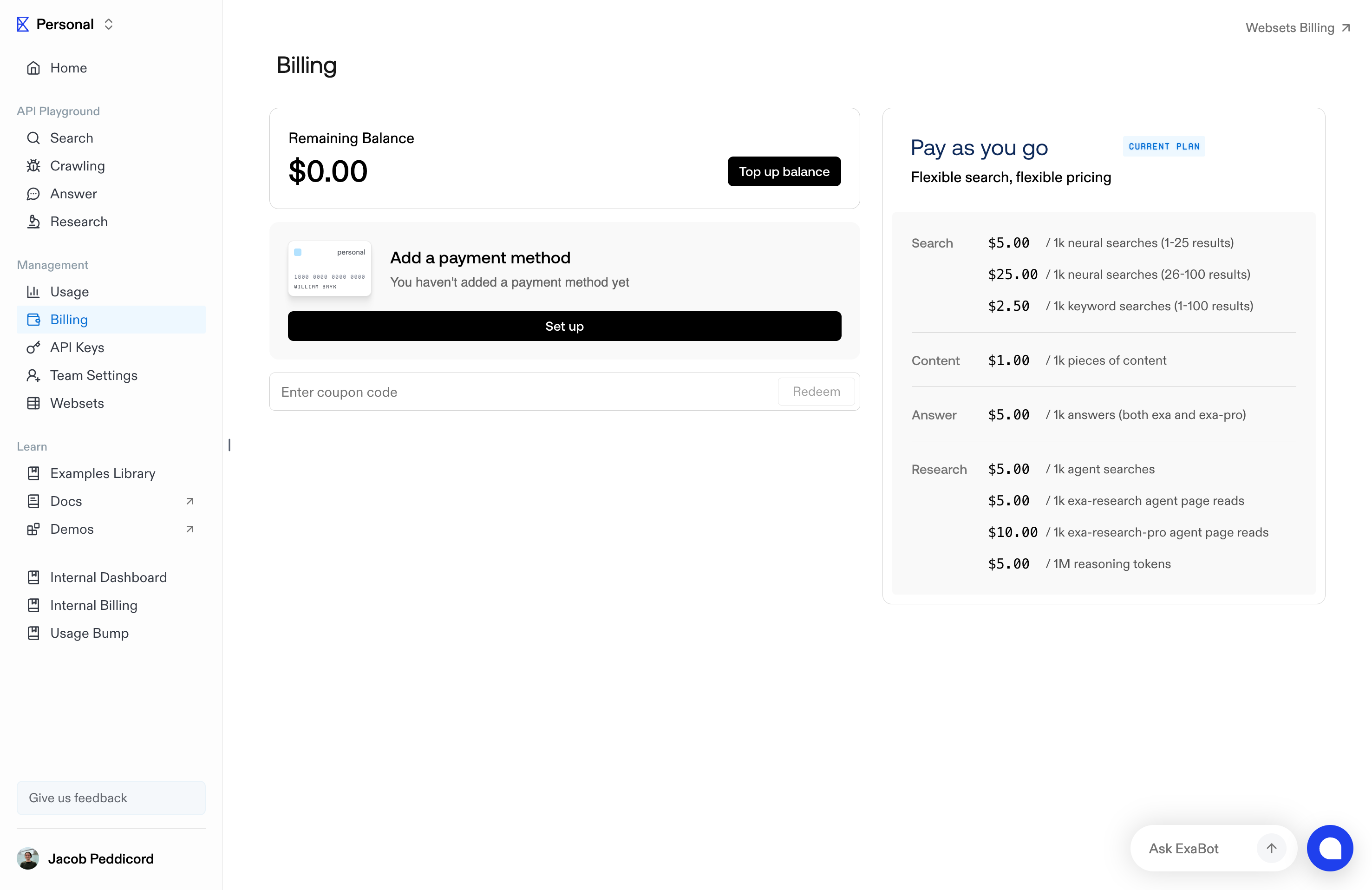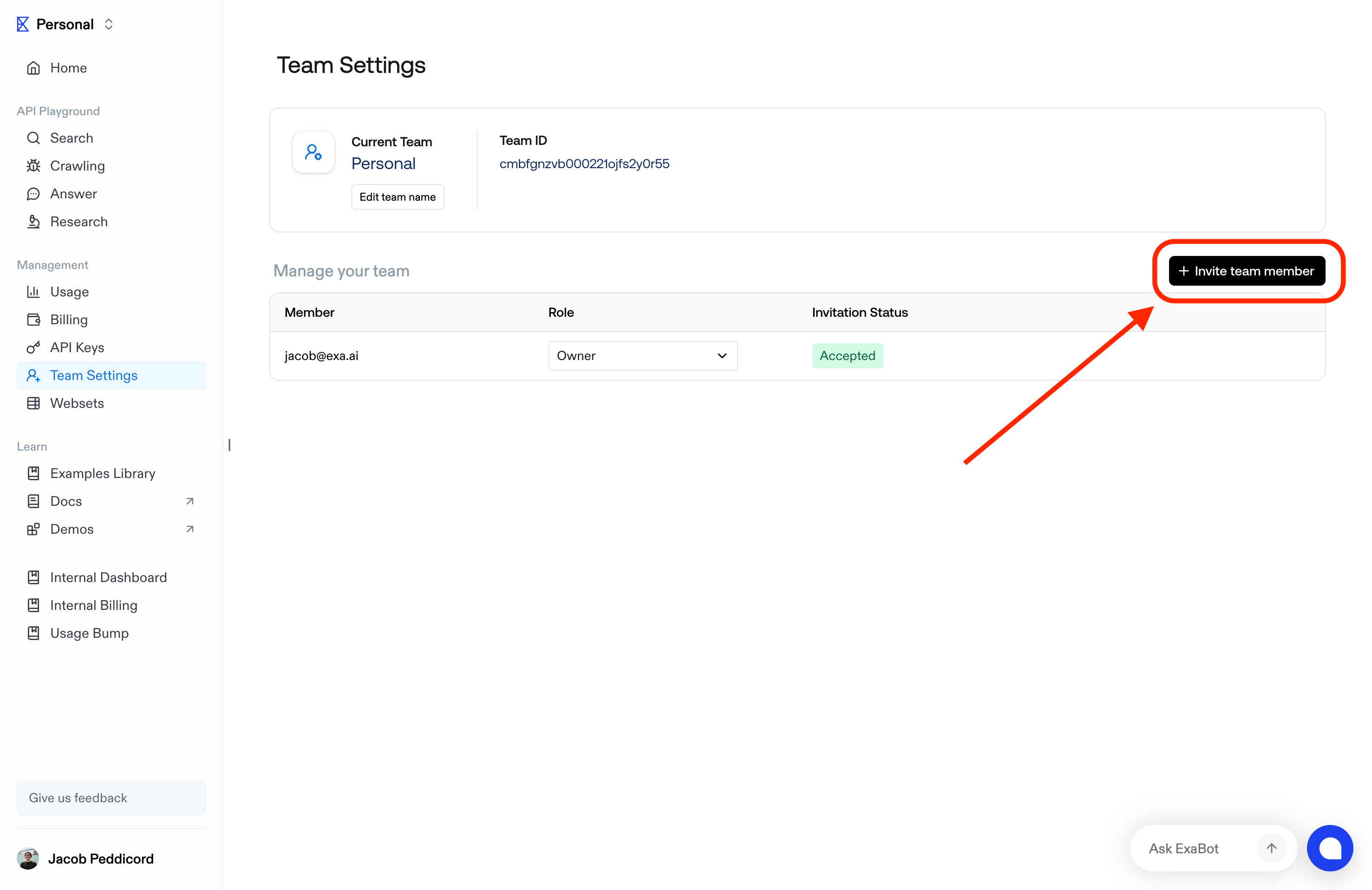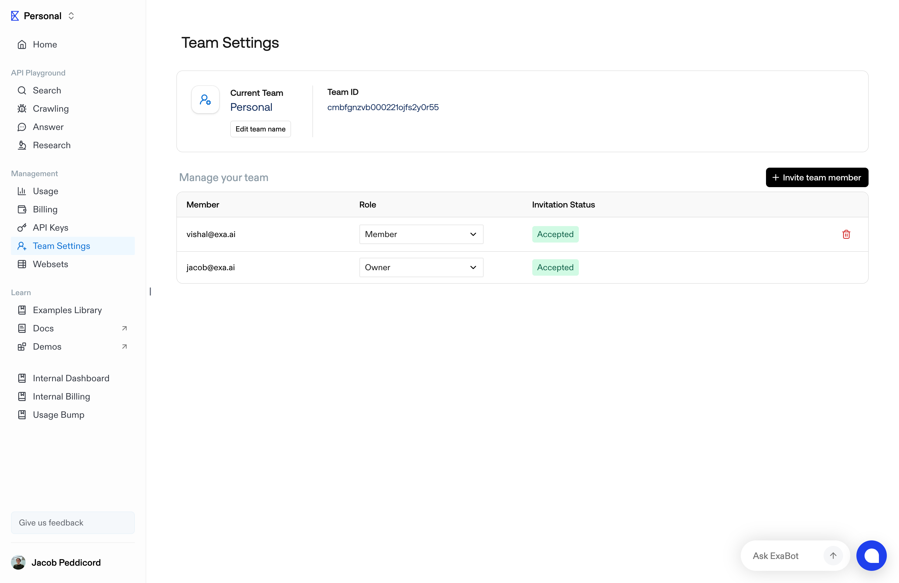 Go to API Dashboard Exa organizes account usage and paid feature access through ‘Teams’: Upon account creation, you’re placed in a ‘Personal’ Team. You can use the dropdown in the top-left of the Exa dashboard shown below to create a new Team or select between other Teams you have. You can make as many Teams as you like.