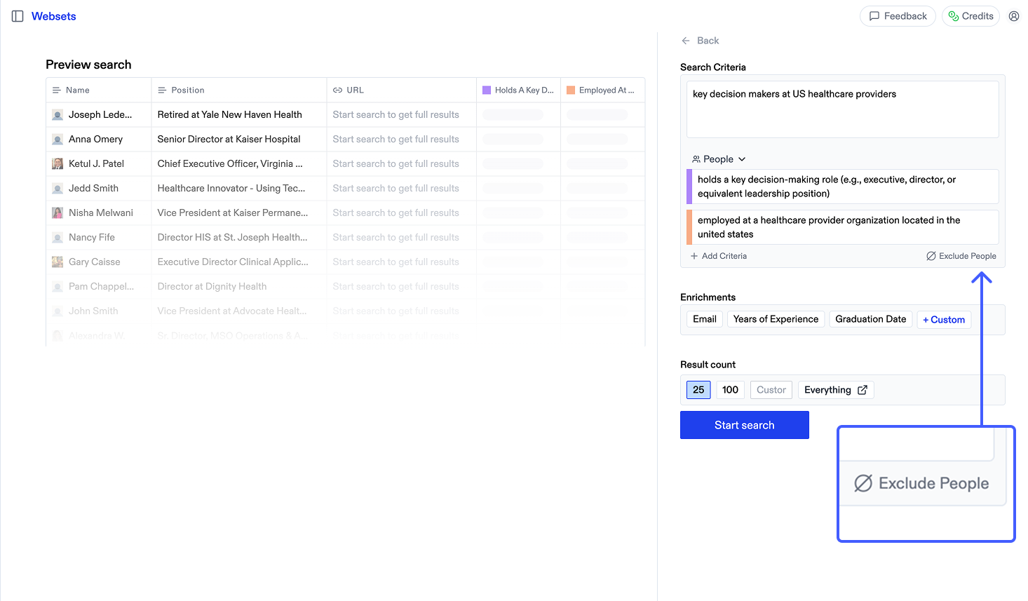 The Exclude Results feature ensures you don’t get duplicate results when creating new searches. By specifying URLs to exclude based on previous Websets or uploaded CSV files, you can focus on discovering fresh, unique results that complement your existing data.How it works